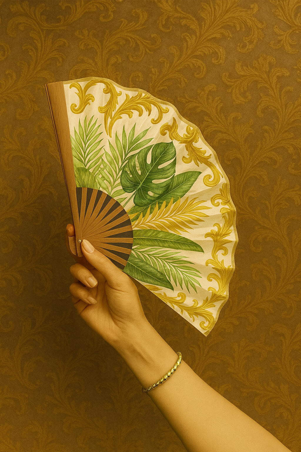 Una pieza imprescindible para ceremonias al aire libre. Nuestro abanico plegable con ilustración tropical y la palabra "AMOR" enmarcada en un diseño barroco con tonos dorados y hojas del trópico.